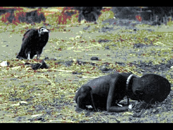 A Fotografia Anterior • Pulitzer 1994 - Kevin Carter • Esta foto foi vencedora do "Prémio Pulitzer", e foi tirada em 1994, durante a grande crise de fome que avassalou o Sudão. • A foto mostra uma criança faminta e agonizante, que rasteja na direcção dum campo de alimentos das Nações Unidas, situado a 1 km de distância. • O abutre espera que a criança morra, para a poder comer. Esta foto chocou o mundo inteiro. Ninguém sabe o que aconteceu à criança, nem mesmo o fotografo, que deixou o local logo que terminou a foto. • Três meses mais tarde, Carter suicidou-se devido a uma depressão.