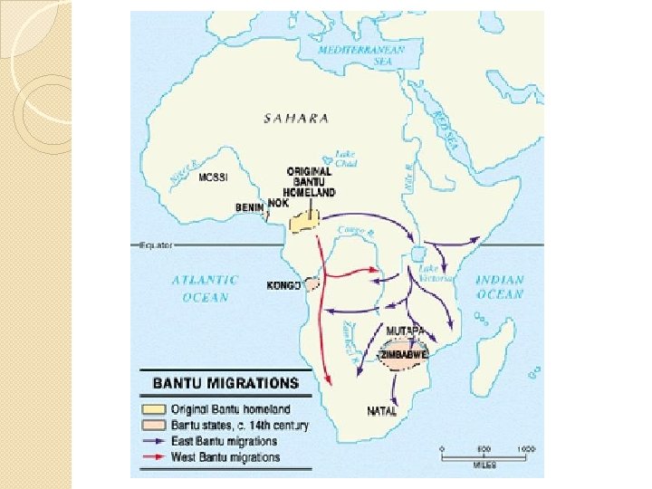Bantu “Migrations” Originally, archeologist thought the Bantu migration was a mass movement Evidence now shows that the Bantu moved about slowly and intermarried into tribes and affected the culture of these tribes The term migration is misleading as the movement took several centuries
