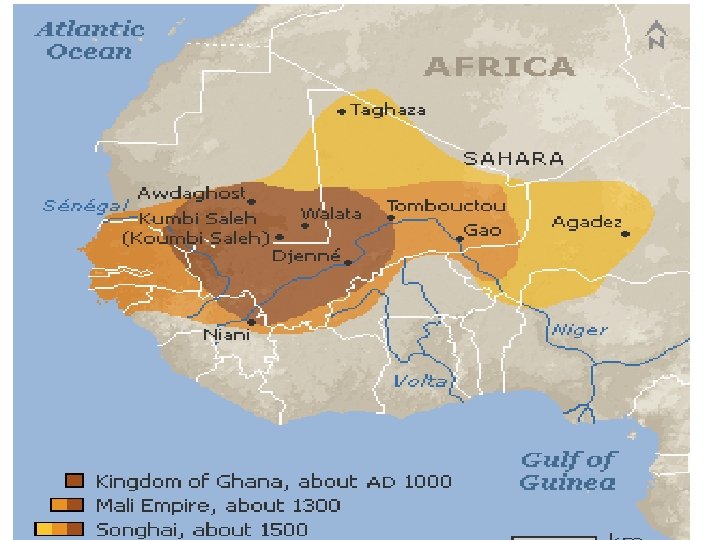 Ghana • By 800 AD kingdom of Ghana formed by Soninke people united • Gold-Salt trade controlled by Ghanaian kings • Trade capital of W. Africa • Ghana became known as the land of gold