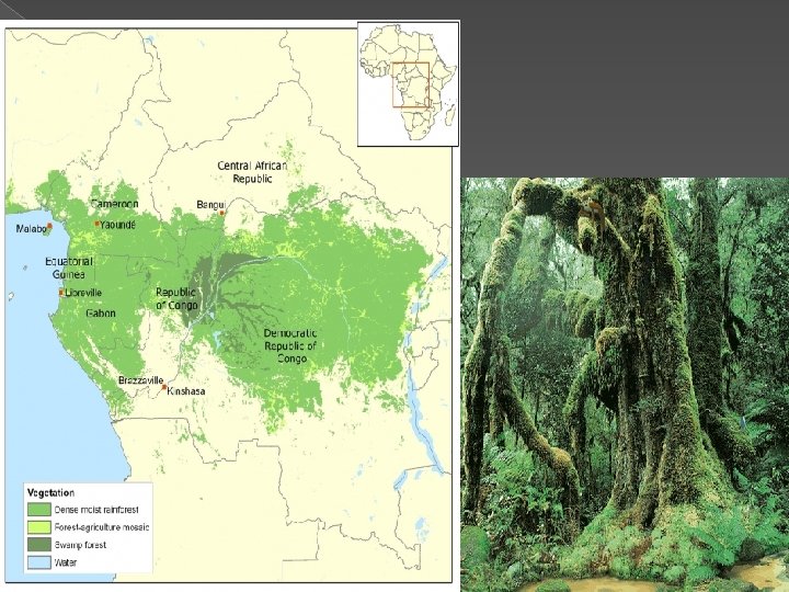 The Congolese Rainforests The Democratic Republic of the Congo lies along the equator and has a climate that is warm year round with plenty of rainfall. � The huge Congo River, the 3 rd longest river in Africa, flows through the region and is fed by hundreds of smaller rivers. � Tropical rainforests grow in abundance in the northern half of the country. These rainforests provide many natural resources that helps to support the people who live here. � The forests provide timber, like mahogany and teak. These are both rare and expensive woods that are often used in furniture making. Tropical plants also provide medicines, rubber, and tropical fruits. �