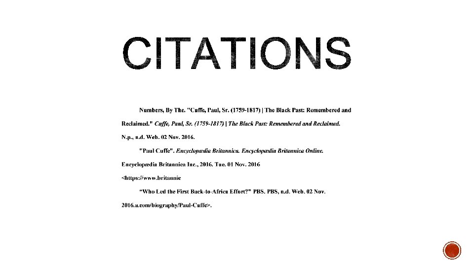 § Paul Cuffee. Digital image. Https: //en. wikipedia. org/wiki/Paul_Cuffee. N. p. , n. d. Web. 9 Nov. 2016. § Paul Cuffee. Digital image. Http: //www. pbs. org/wnet/african-americans-many-rivers-to- cross/history/who-led-the-1 st-back-to-africa-effort/. N. p. , n. d. Web. 9 Nov. 2016.