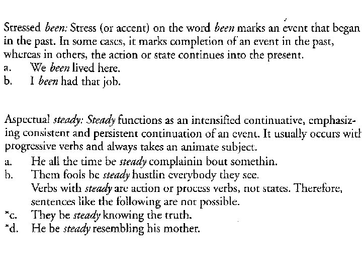 AAVE Aspect • Aspect is the manner in which events occur. – Aspect is sometimes marked on verbs. • Standard English has few aspect markers – /-ing/ progressive • AAVE has six aspect markers (an aspect system) – African languages generally have aspect systems