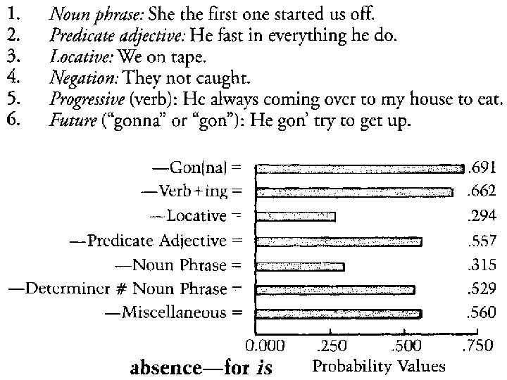 Prevalence of African-American Vernacular English Significant proportions of African-Americans have a vernacular way of speaking that shares features with other African-Americans. • Individual speakers differ in frequency of non-standard forms. –Females use fewer than males –Middle class use fewer than Working class
