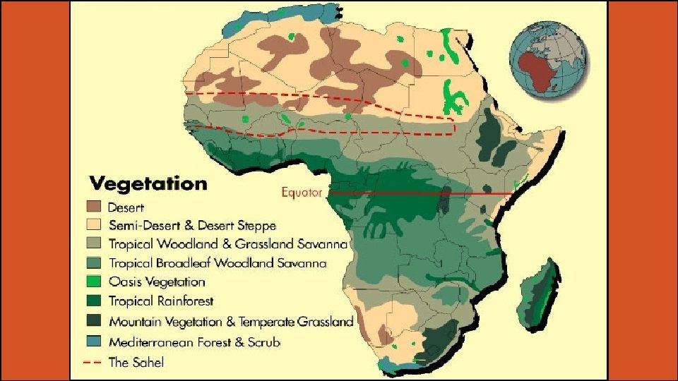 Africa • Africa is the world’s second largest continent (11, 700, 000 miles). • It is home to 52 countries, 1, 000 different languages, and 800 million people. • 10% of the world’s population lives in Africa. • The one thing that all African nations have in common is their reliance on the land’s physical characteristics, which affect where people live, work, & trade. • Africa can be divided into many different regions: • The Sahara, the Sahel, the savannahs, the tropical rain forests, the Ethiopian Highlands, and Southern Africa.