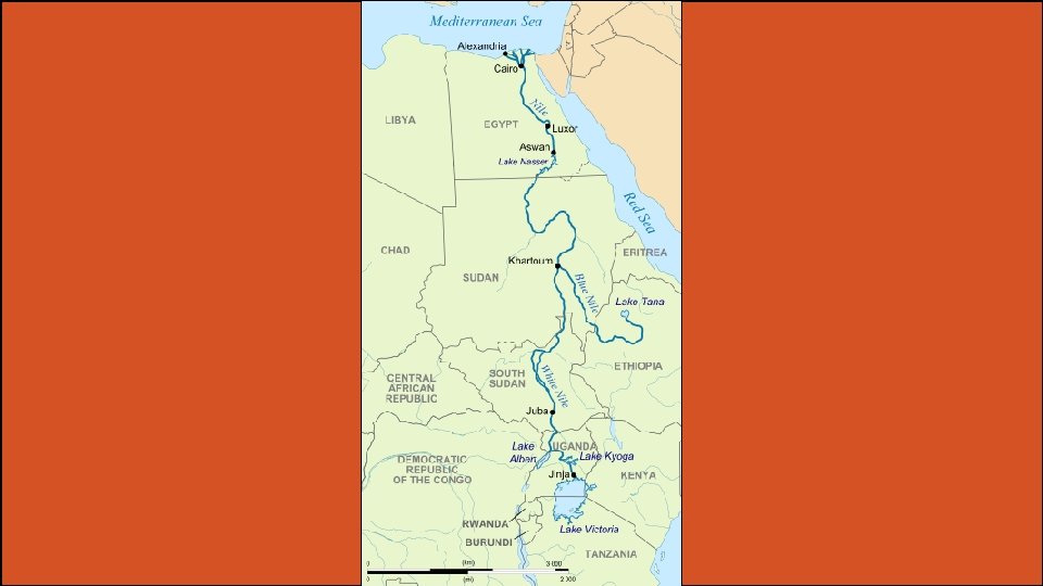 Nile River • The Nile River is located in eastern Africa. • It starts in East Burundi and flows northward and empties into the Mediterranean Sea. • The Nile is the world’s longest river at 4, 150 miles. • It provides water for Sudan and Egypt. • It’s an important waterway for transporting people and goods. • The Nile also provides a source of irrigation for agriculture.