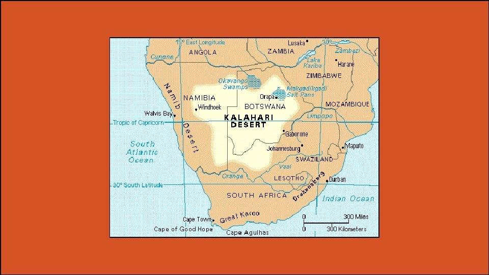 Kalahari Desert • The Kalahari Desert is located in southwestern Africa. • It covers parts of Botswana, Namibia, and South Africa. • The region is surrounded by semi-arid areas that are slowly becoming more dry. • It is not a “true” desert because it receives 3 -10 inches of rain per year. • Because of the precipitation and underground water supplies, grass, shrubs, and wild animals manage to live in the Kalahari desert.