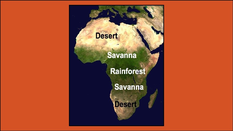 Tropical Rain Forest • Africa’s tropical rain forest is located along the central coast of Africa, near the Equator. • It lies in the Congo River Basin. • The rain forest covers 1/5 th of the land surface of Africa and touches 37 countries. • The rain forest has a hot, humid climate. • The annual rainfall is over 17 feet. • There is a large variety of animals found in this region. • Trees are so thick and tall that sunlight never reaches the forest floor! • The trees grow hundreds of feet tall. • It’s the second largest rain forest in the world; the Amazon rain forest in Brazil is the largest. • Unfortunately, this rain forest has shrunk due to deforestation.