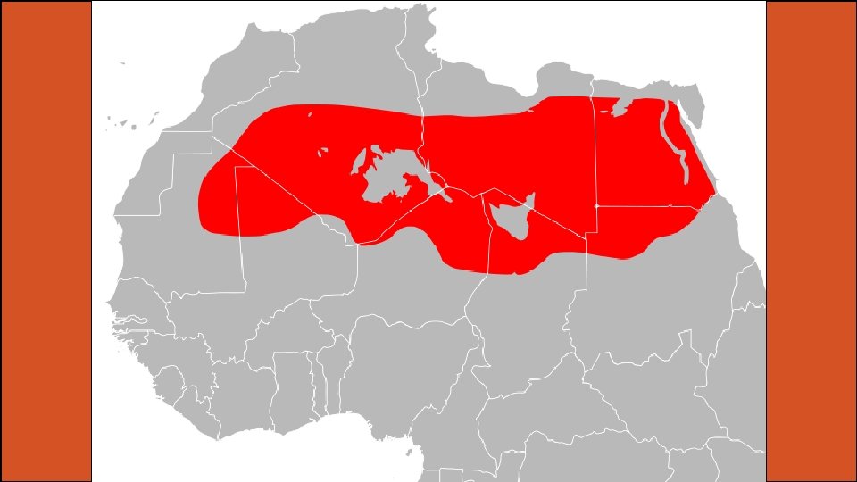 Sahara Desert • The Sahara is the world’s largest desert (3, 500, 000 miles). • It runs across the width of northern Africa. • It covers 1/3 rd of the continent. • It divides the continent into two distinct regions – North Africa and sub. Saharan Africa. • The Sahara is covered with sand dunes, rocky hills, and stretches of gravel that continue for miles and miles. • Very few people live in the desert because it is considered one of the harshest places to live in the world. • The people who do live here are called nomads. • They move from place to place, usually traveling by camel, looking for food & water.