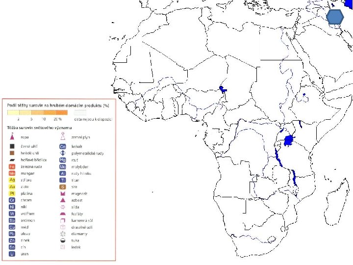 I. Nahraď hlavní africké producenty uvedených surovin představených vlajkami názvy států. Další nerostné suroviny �Uran �Fosfáty �Kobalt (Afrika 90 % světa) 40 % �Bauxit �Platina (90 %) 85 % �Zlato (50 %) + Mali, Tanzanie, Ghana �Chrom + Zimbabwe �Mangan + Gabon, Ghana �Diamant + Botswana, Zambie, Zimbabwe, Angola, Demokratická republika Kongo