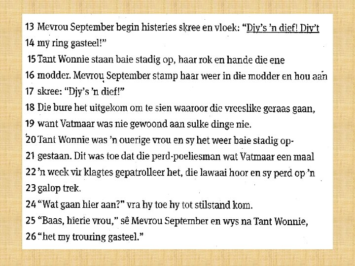 • 2. *Tant Wonnie (word beskuldig) *Sy word daarvan beskuldig dat sy die ring gesteel het. *Sy wys beskuldigend met haar vinger na tant Wollie. • 3. *Die verwagting word geskep dat sy vriendelik gaan wees. *In teenstelling met bogenoemde verwagting, gooi mev. September die koffie op die grond uit en skree op tant Wonnie. *Ek dink mev. September is ongeskik en het geen respek vir haar medemens nie.