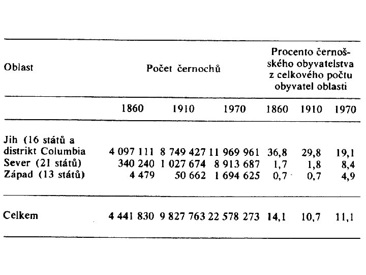 Konflikt se stěhuje na Sever • Příliv velkého počtu černochů do Severních států tam přenesl i rasové napětí. • Černoši byli levnou pracovní silou a připravovali o práci bílé Američany a přistěhovalce. • Z Jihu odcházeli především mladí a schopní. Jih se vylidňoval a chudl. • Na Severu černoši směřovali do měst, kde nacházeli snadněji práci. • V roce 1860 bydlelo jen necelých 16% černochů ve městech, zbytek žil ve vesnicích na Jihu. O čtyřicet let později jich bylo v městech už 27, 7% Ve městech Severu a Západu žily milióny černochů.