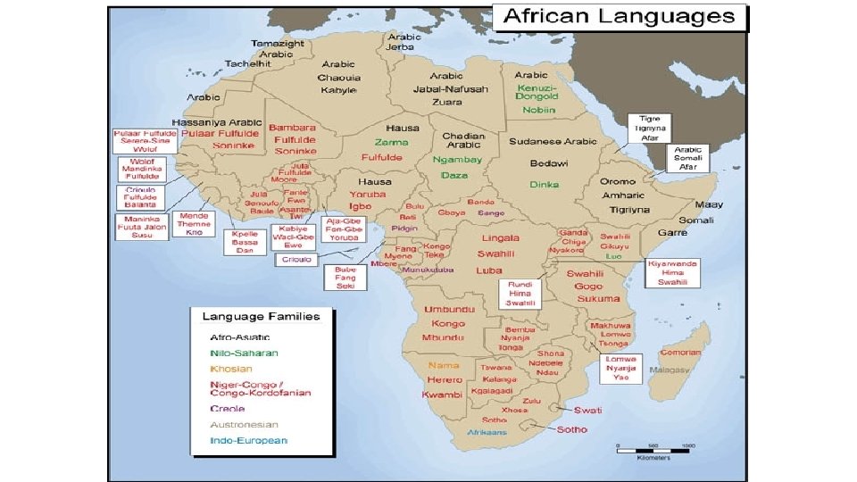 LANGUAGES OF AFRICA • There are 1, 000 spoken languages in Africa and many are unwritten. • There are 4 major indigenous language families; • Afro-Asiatic of N. Africa • Nilo-Saharan • Niger-Congo • Khosian • Largest ethnic groups are associated with a language.