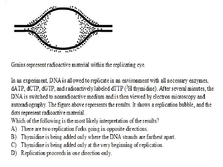 • You briefly expose bacteria undergoing DNA replication to radioactively labeled nucleotides. When you centrifuge the DNA isolated from the bacteria, the DNA separates into two classes. One class of labeled DNA includes very large molecules (thousands or even millions of nucleotides long), and the other includes short stretches of DNA (several hundred to a few thousand nucleotides in length). These two classes of DNA • probably represent • A) leading strands and Okazaki fragments. • B) lagging strands and Okazaki fragments. • C) Okazaki fragments and RNA primers. • D) leading strands and RNA primers. • E) RNA primers and mitochondrial DNA.