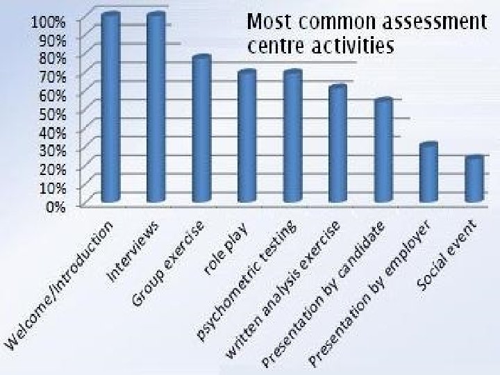 Special features of the assessment centre 1. Focus on behavior of job applicant 2. Use multiple type of evaluation techniques 3. There are multiple assessors 4. There are multiple job candidates 5. Assessors’ conference occurs 6. Feedback is given to all job candidates about their strength and weaknesses