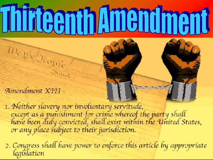 Amendments and Laws to help Freed Slaves 1. Thirteenth Amendment 2. Fourteenth Amendment 3. Fifteenth Amendment 4. Freedmen’s Bureau