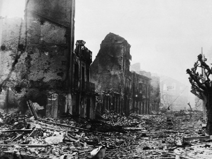 Post-war Europe Description: • London, Warsaw, Berlin suffered terrible destruction • War torn cities had displaced agriculture • Spread of famine and disease • Missing able bodied men to plant fields • First winter after the war there was no food, shoes or coats