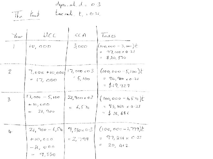 For an after-tax analysis, we reduce the initial cost of a capital acquisition by the present value of the taxes saved by depreciating it. The government groups all possible capital acquisitions into a small number of classes, and sets rules for how fast the assets in a given class can depreciate. You begin each year with a certain amount in each asset class – the `Undepreciated Capital Cost’, or `UCC’ – and depreciate it by the Capital Cost Allowance, or `CCA’.