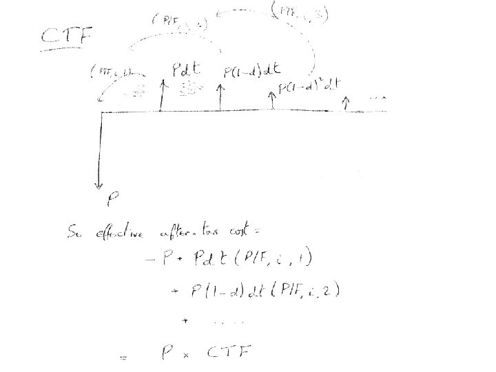The CTF When we buy an asset for $P, we can depreciate it in future years at a rate d. Each year we subtract the depreciation amount, P(1 -d)nd, from our pre-tax cash flow. So each year we save an amount of money P(1 -d)ndt which we would otherwise have paid in taxes. This series of savings has a present worth PX that can be calculated from P, d, t, and our cost of capital, i. So the effective present cost, in an after-tax analysis, is P – PX, or P (1 -X). The factor (1 -X) is called the CTF