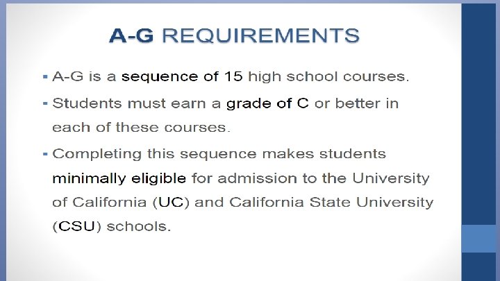General Advice Earn the best grades possible ( in “a-g” courses and in ALL courses) Take similar level of rigor in all 4 years of high school (no senioritis) Complete courses beyond the “admissions eligible” “a-g” requirements. Engage in extracurricular activities but not to the detriment of your academic progress. ● Complete as many honors/AP/college level courses as possible wherein high achievement is likely. (Students need to weigh the benefits of honors/AP/College level course completion against the likely effect upon one’s overall grade point average. ) ● ●