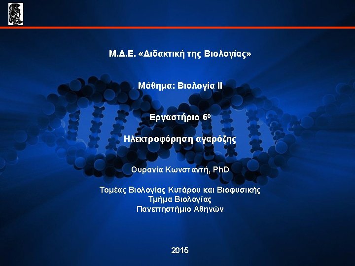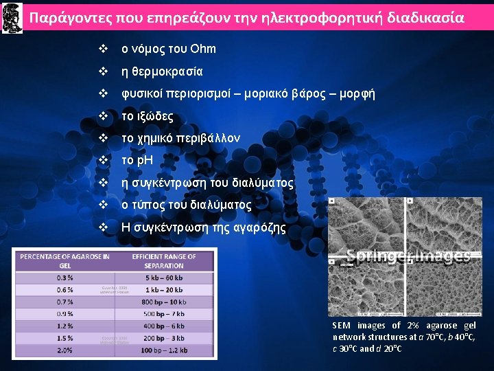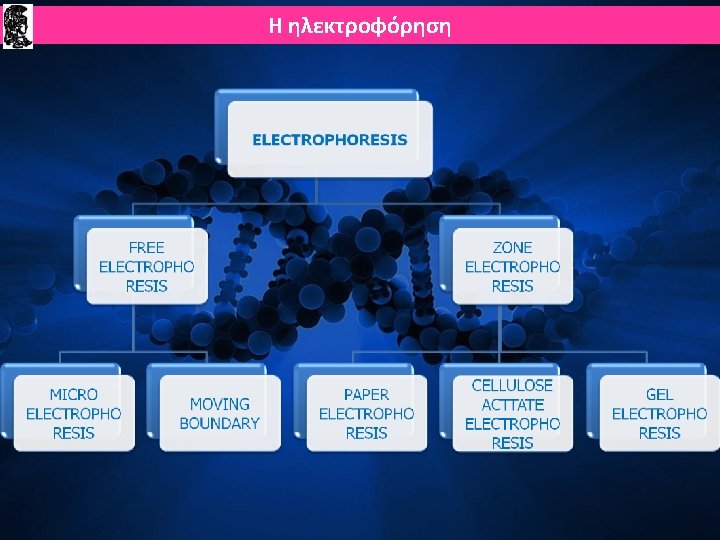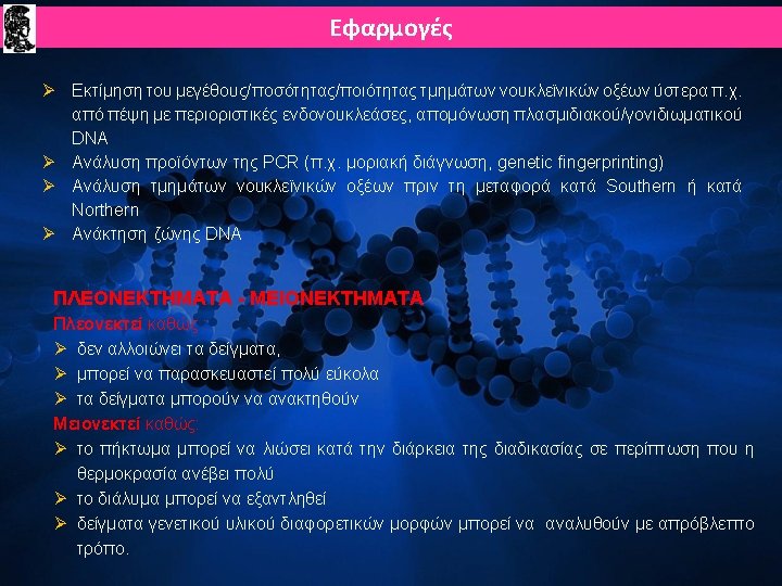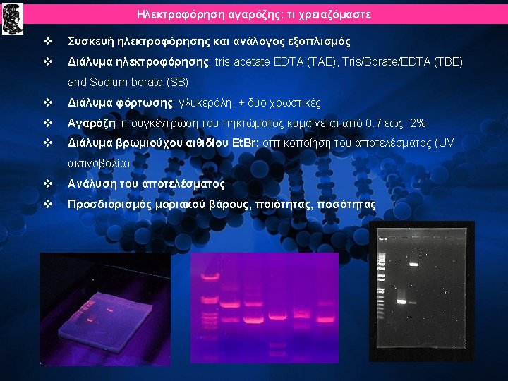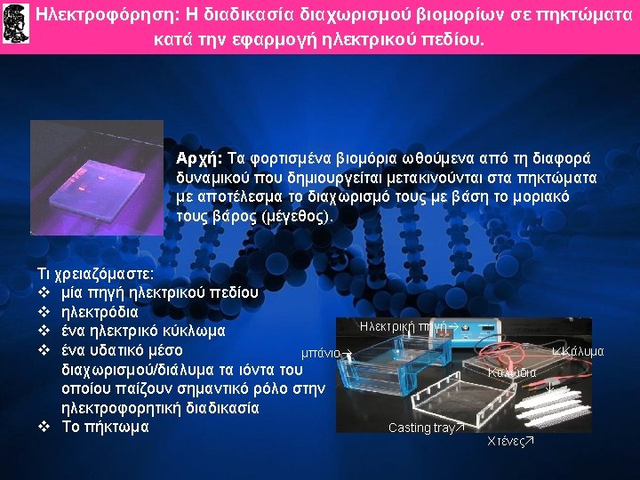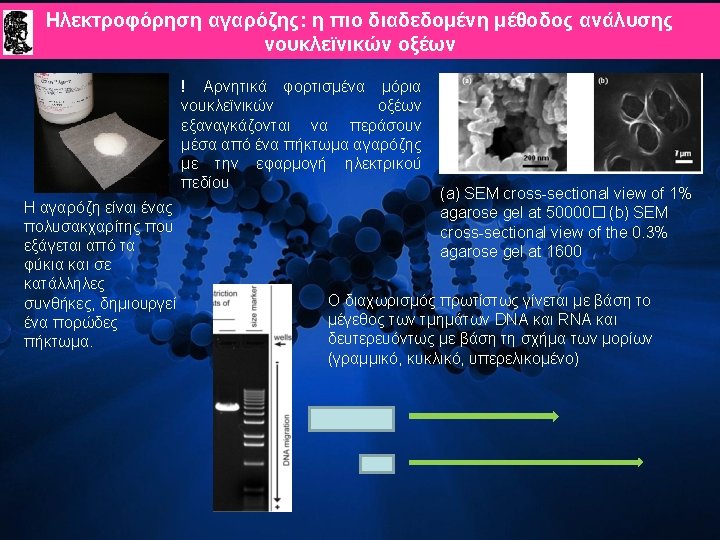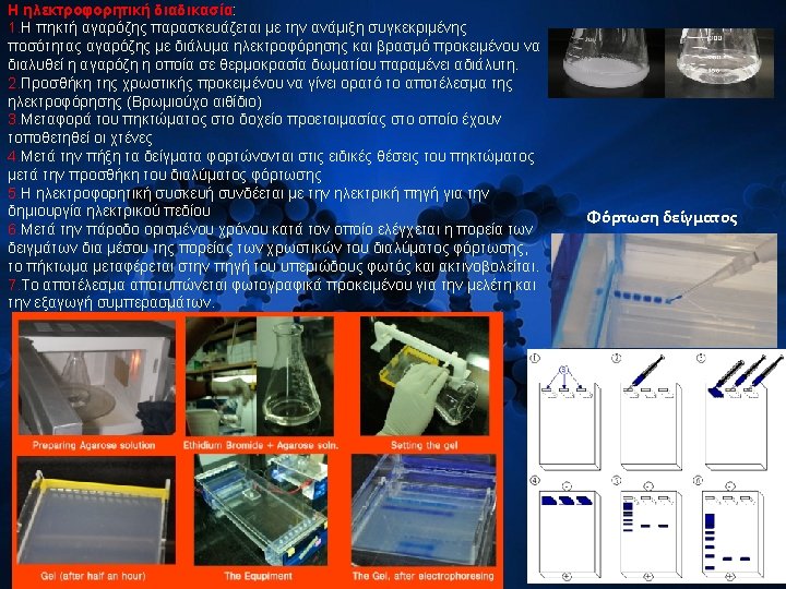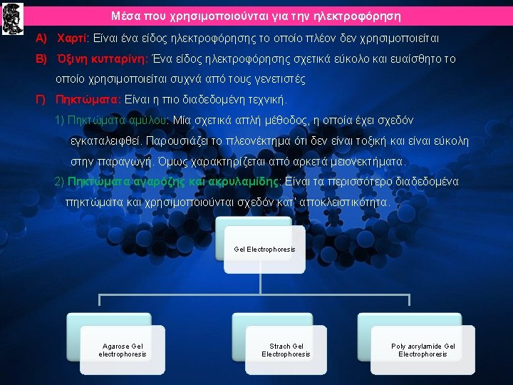 Είδη πηκτωμάτων Agarose • • • Polysaccharide extracted from sea weed. Gel casted horizontally Non-toxic. Separate large molecules Commonly used for DNA separations. Staining can be done before or pouring the gel. Polyacrylamide Gel • • • Cross-linked polymer of acrylamide. Gel casted vertically. Potent neuro-toxic. Separate small molecules. Used for DNA or protein separations. Staining can be done after pouring the gel.