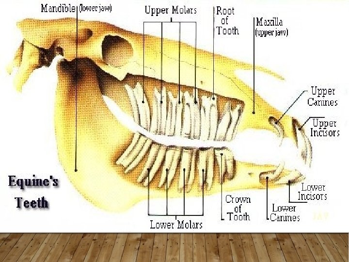 TYPES OF TEETH • Adult horses typically have 36 -44 teeth • 12 Incisors (6 upper and 6 lower) • 12 Pre-molars • 12 Molars • May have • Canines (4) • Wolf teeth (2)