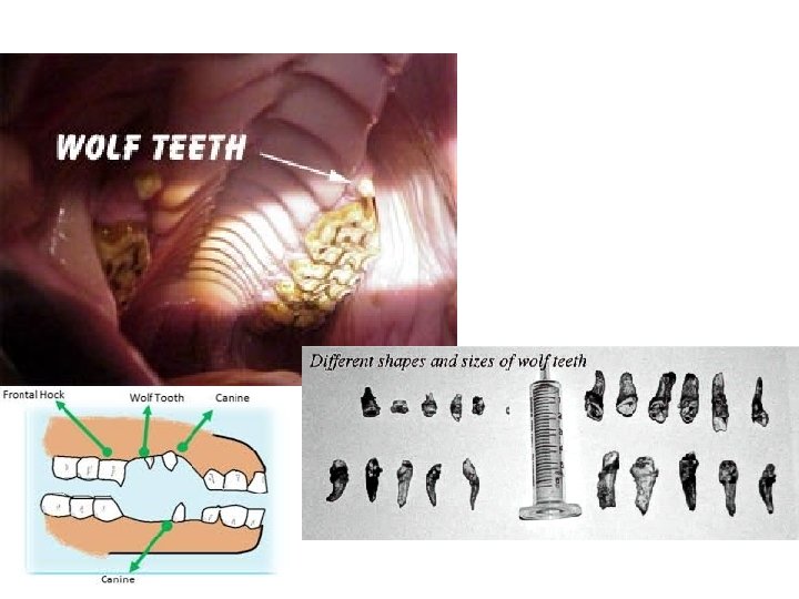 Wolf Teeth • Wolf teeth are similar to our wisdom teeth – Some horses have them, others don’t – Some have to be removed, others don’t – No functional purpose today • Residual “appendage” from past • “Wolf” used to mean “bad” – appears in front of upper molars