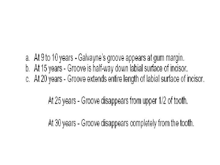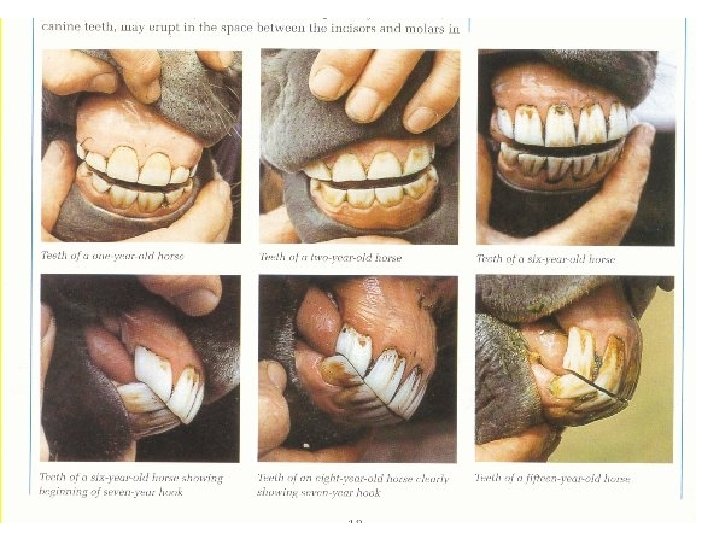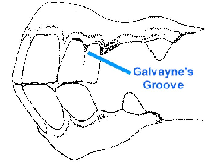 Extras • A hook (worn edge) may appear on upper corner incisors at 7 to 11 years • Galvayne’s Groove – Line that appears on the upper corner incisors around 10 to 11 years, gets longer as horse ages. • Angle of Incidence – angle at which the incisor teeth meet. Increases and teeth wear down as horse ages.