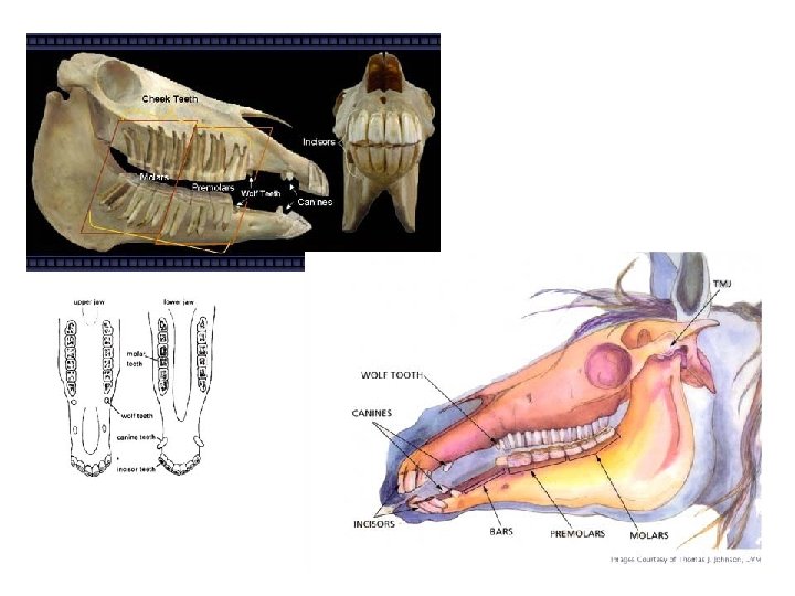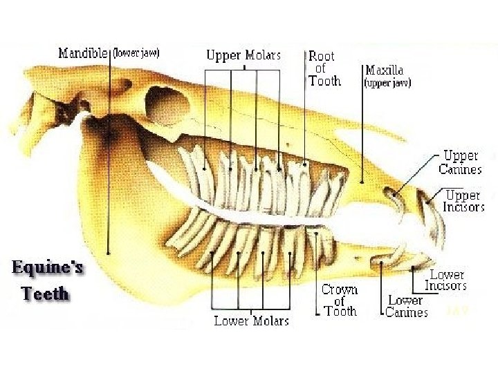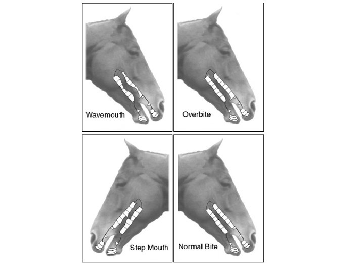 Types of Teeth • Adult horses typically have 36 -44 teeth – 12 Incisors – 12 Pre-molars – 12 Molars • May have – Canines (4) – Wolf teeth (2) (6 upper and 6 lower)