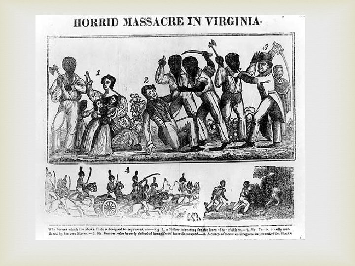 Nat Turner’s Rebellion 1831 - 80 slaves in Virginia attacked several plantations, killing 60 whites State militia captured Turner and his followers Put on trial, convicted and hanged Significance: White on black violence erupted- 200 killed Southern whites determined to defend the institution of slavery Slave codes- state laws passed to restrict slaves’ activities
