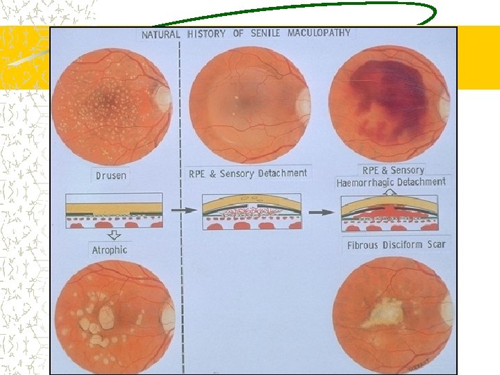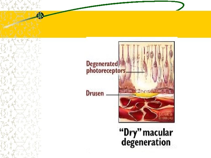 AGE RELATED MACULAR DEGENERATION Insufficient oxygen and nutrients damages photoreceptor molecules With ageing, the ability of RPE cells to digest these molecules decreases Excessive accumulation of residual bodies (drusen) RPE membrane and cells degenerate and atrophy sets in and central vision is lost BMJ 326, 2003; 485 -488