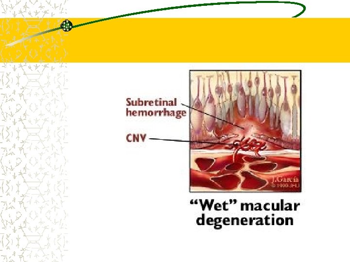 WET MACULAR DEGENERATION Accounts for about 10% Also called choroidal neovascularization, subretinal neovascularization or disciform degeneration Abnormal blood vessels grow beneath the macula These vessels leak blood and fluid into the macula damaging photo receptors Progresses rapidly and can cause severe damage to central vision http: //www. blindness. org