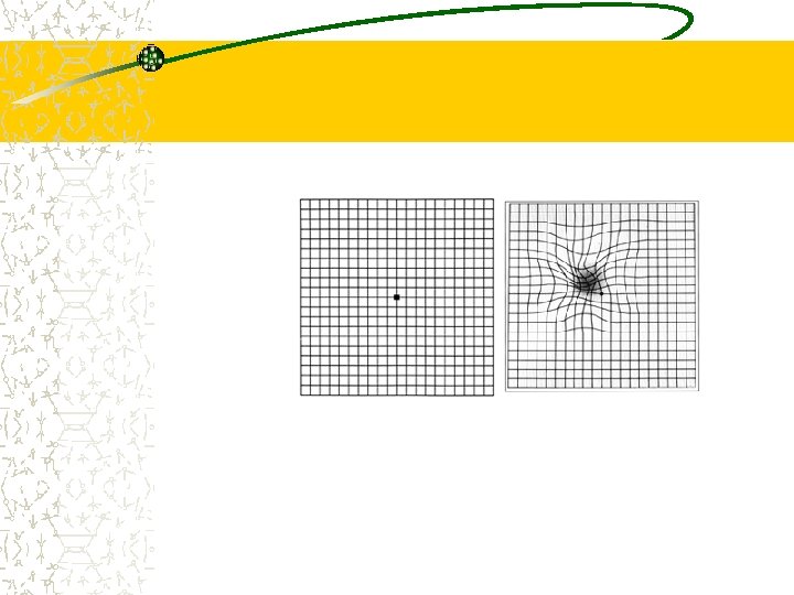 AMD: DIAGNOSIS Visual acuity is tested using the standard eye chart. It measures vision at various distances and can detect vision loss Amsler grid test: Assesses distorted or reduced vision and small irregularities in the central field of vision Retinal examination: Done through slit lamp microscope examination: to detect drusen, as well as neovascularization Fluoroscein angiography: Determines the presence and location of neovascularization Ref: http: //www. visionchannel. net