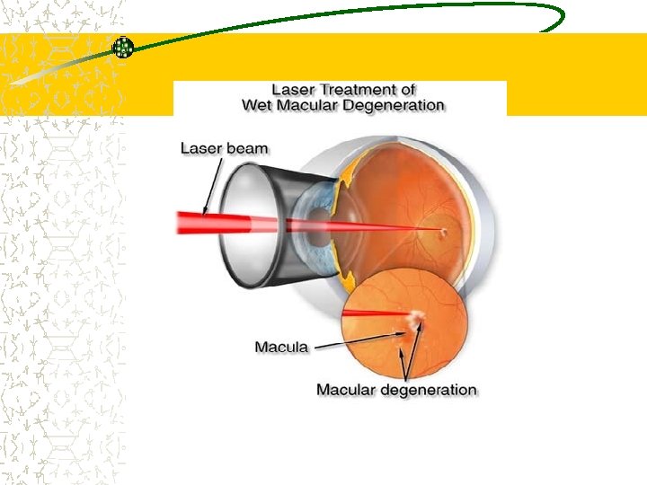 LASER PHOTOCOAGULATION Intravenous fluoroscein angiography is performed Well-circumscribed new blood vessels identified on the fluoroscein angiogram Treated with laser photo coagulation after topical or local anaesthesia