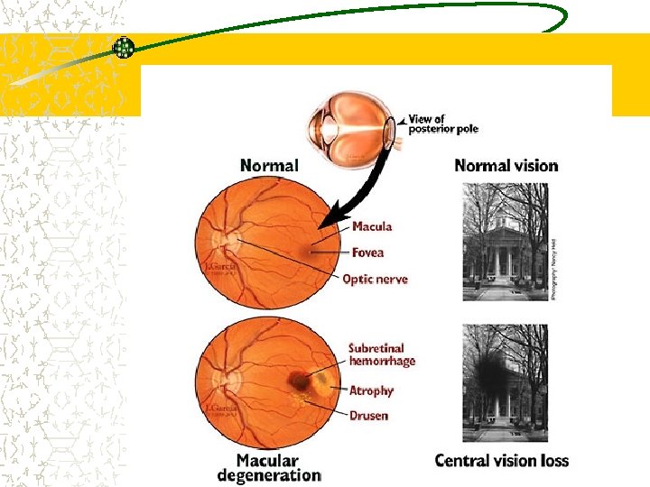AGE RELATED MACULAR DEGENERATION Insufficient oxygen and nutrients damages photoreceptor molecules With ageing, the ability of RPE cells to digest these molecules decreases Excessive accumulation of residual bodies (drusen) RPE membrane and cells degenerate and atrophy sets in and central vision is lost BMJ 326, 2003; 485 -488