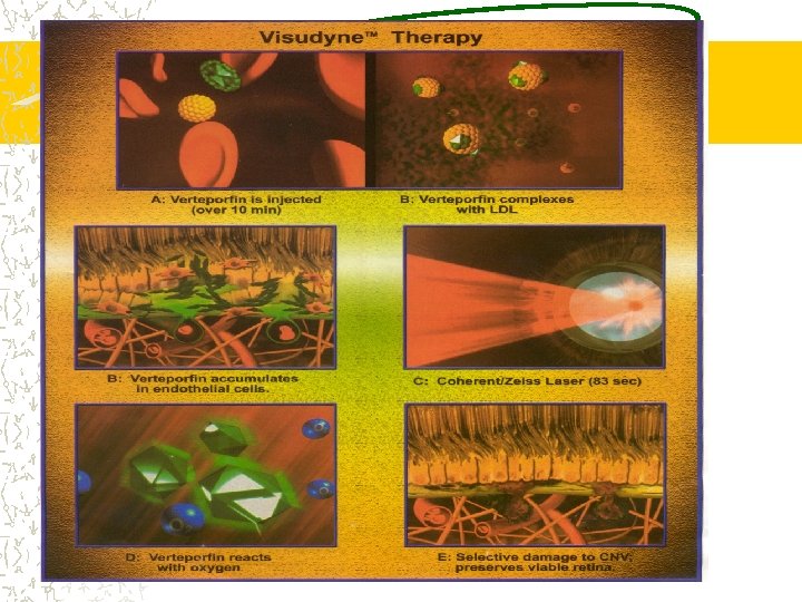 PHOTODYNAMIC THERAPY PDT for AMD is a two stage process comprising a 10 minute intravenous infusion of 6 mg/kg verteporfin followed by activation 5 minutes later by 689 nm diode laser for 83 seconds at 503/cm 2 The photosensitive verteporfin is selectively taken up by rapidly proliferating endothelial cells within the target CNV reaching its peak concentration at 15 minutes Cytotoxic reactive oxygen intermediates damage cellular proteins and cause