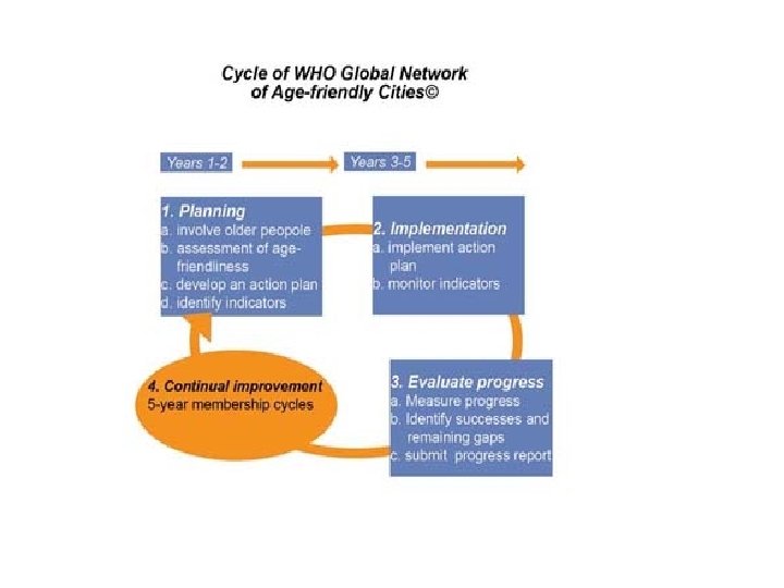 Age-friendly cities – key milestones WHO research and guidance 2007 Global Network of Age-friendly Cities 2010 Age-Action Alliance 2011 Ageing Well resource 2012 UK Urban Ageing Consortium 2012 UK Age-friendly City Network 2012 WHO affiliation 2013