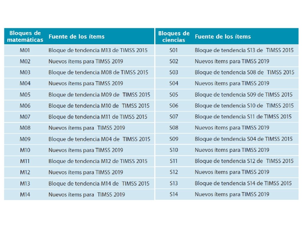 AGENCIA ANDALUZA DE EVALUACIÓN EDUCATIVA Presentación de la evaluación internacional TIMSS Febrero 2019 2 EL ESTUDIO INTERNACIONAL TIMSS ¿Qué instrumentos utiliza el estudio? • Prueba para el alumnado: • Cada cuadernillo está formado por cuatro bloques: dos de matemáticas y dos de ciencias. • Cada bloque tiene entre 10 y 14 ítems. Asimismo, para facilitar el cálculo de las tendencias entre las ediciones de la prueba, se utilizan algunos de los bloques de la edición anterior (2015). • Los cuadros siguientes explicitan los distintos bloques y cómo se distribuyen en cuadernillos diferentes: