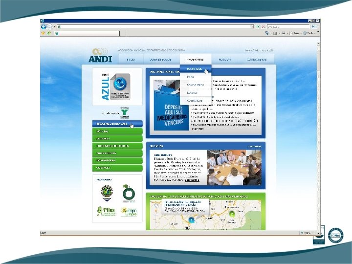 4. 2. OPERACIÓN Y DIFUSIÓN INTERVENTOR Control Ambiental • • ANDI Reportes. Documentos MAVDT Afiliados MAVDT Otras autoridades regionales. • • Radiación de documentos. (individual) Actualización anual de la información • • • Afiliaciones Operación Difusión FENALCO Comercializadores • • Definición de Puntos Azules Contacto con comercializadores • Verificación: • Calidad del trabajo según contratación • Operación según la normatividad de manejo Respel. OPERADOR Sinthya Química • • Instalaciones contenedores Recolecciones Clasificación Destinación final Reportes a ANDI Capacitaciones Coordinación instalaciones Difusión (volantes)