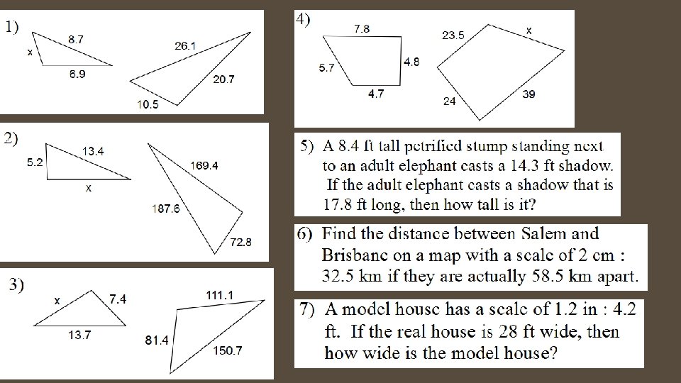 Determine the length of the missing side • Two rectangles are similar. One is 5 cm by 12 cm. The longer side of the second rectangle is 8 cm greater than twice the shorter side. Find its length and width.