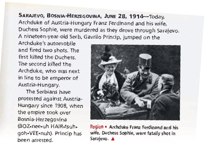 Agenda 2/16/17 • • • TEKS: (6. 1 A) trace characteristics of various contemporary societies in regions that resulted from historical events or factors such as invasion, conquests, colonization, immigration, and trade. (6. 1 B) analyze the historical background of various contemporary societies to evaluate relationships between past conflicts and current conditions. (6. 15 F) identify and explain examples of conflict and cooperation between and among cultures. (6. 17 A) identify and describe how culture traits spread such as trade, travel, and war. (6. 17 D) identify and define the impact of cultural diffusion on individuals and world societies. • Language Objective: Students will take notes on the causes of World War I. • • **GET SPIRALS** 1. Video – Causes of World War I 2. Warm up: What actually caused the start of World War I? 3. The Causes of World War I- STOP AT LUSITANIA • HW: None