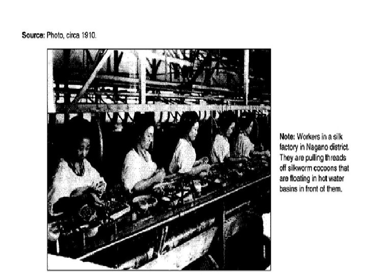 Document A • 1) The women are pulling the silk fibers out of the cocoons of silkworms. • 2) It appears to be a clean, well-lighted place. The workers are wearing the same tidy uniform and may or may not be sitting down. Their hair is neat, which could mean the pace of work is comfortable or that they cleaned up for a company photo shoot. • 3) 61 (12, 519 female workers divided by 205 factories) • 4) The great majority of workers (92%) in the Nagano silk factories in 1901 were women. About two-thirds of the female workers (66%) were under 21. • 5) The work does not look physically demanding. The conditions appear clean and safe. With an average of 66 women in each factory, teenage girls especially would have plenty of company. • 6) The work looks tedious and boring. The workers appear regimented. They are all lifting their right arms in unison as if they are being closely watched. 18% of the workers are 14 or under. The factory is exploiting young girls.