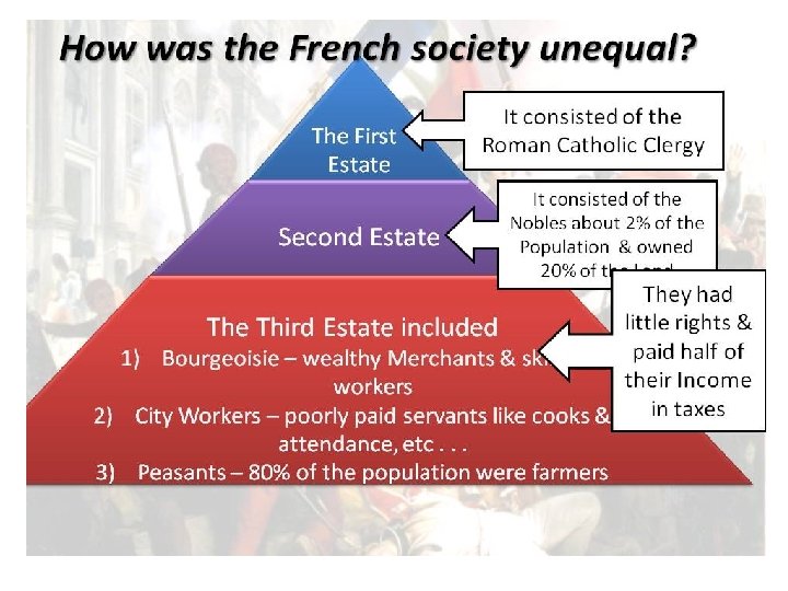The Old Order • During the Enlightenment, France was governed by Old Regime—Political system in France based on social classes –First Estate (Church)—Owned 10 percent land, lightly taxed – Second Estate (Nobles)—Owned 20 percent land, lightly taxed –Third Estate (Peasants) – 97% of population, Heavily taxed • Society had been divided into estates in France since the Middle Ages – several hundred years old • Power is kept in the First and Second Estates – Class of Nobles • Typically, the King is considered above all three estates