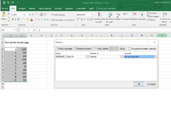 ABC-analyse Step 1 Sorteer de gekozen variabele (hier: inkoopaantal (usage)) in volgorde van hoog naar laag Step 2 Bereken het totaal 28