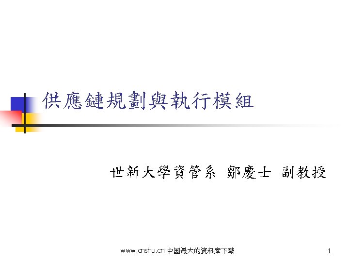 Agenda n n n Overview/Features of SCM Supply Chain Network Design Advanced Planning and Scheduling Shop Floor Control MES/MCS www. cnshu. cn 中国最大的资料库下载 2