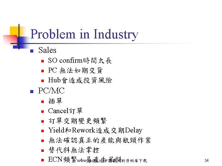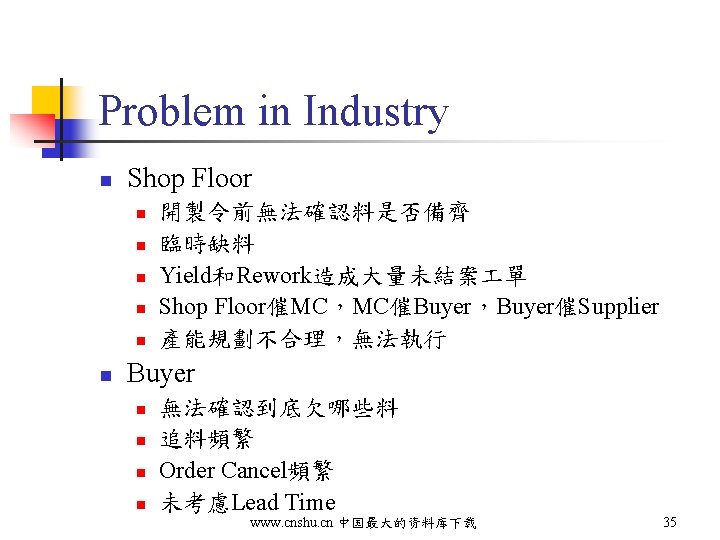 Typical Planning Process Supply/Demand Meeting Change Production Plan n n MRP/ERP Receiving/Receipt Manual Adjustment Release PO Can not deliver on time Long promise time Dead items & shortage Customer unsatisfied www. cnshu. cn 中国最大的资料库下载 32