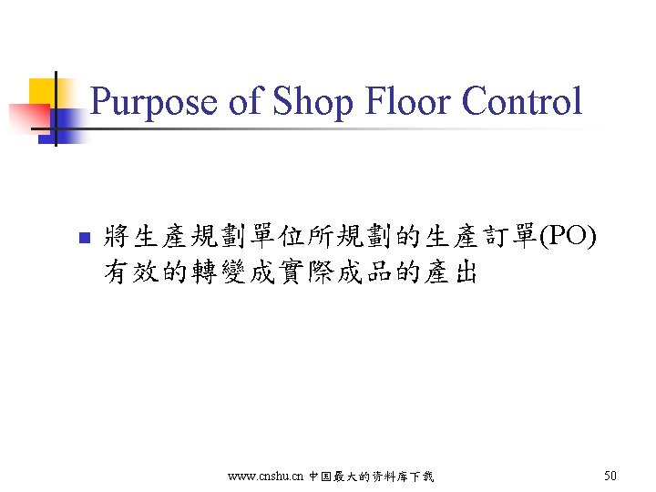 Agenda n n n Overview/Features of SCM Supply Chain Network Design Advanced Planning and Scheduling Shop Floor Control MES/MCS www. cnshu. cn 中国最大的资料库下载 49
