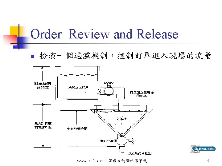 Functions of Shop Floor Control n n n Order review/release Detailed shop floor operations scheduling Data collection/monitoring Control/feedback Order disposition www. cnshu. cn 中国最大的资料库下载 52
