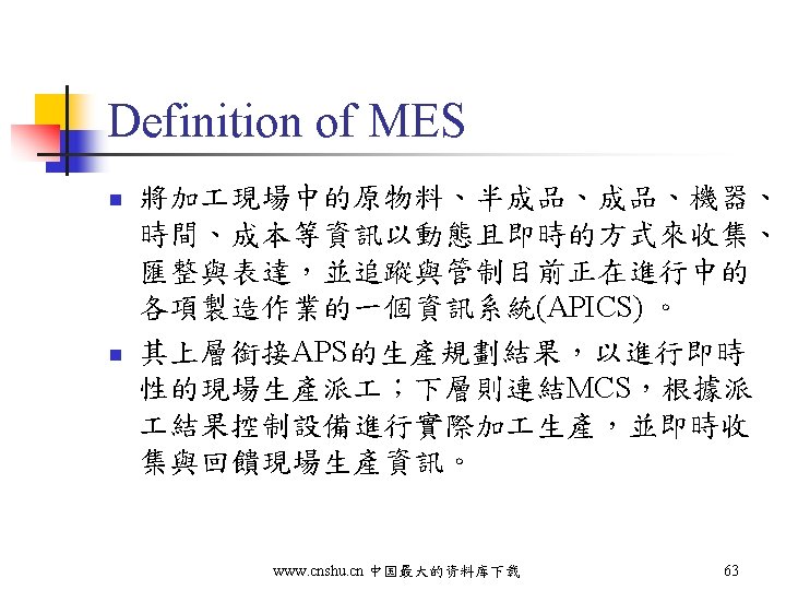 Relationships of ERP/APS/MES/MCS ERP APS MES MCS www. cnshu. cn 中国最大的资料库下载 61