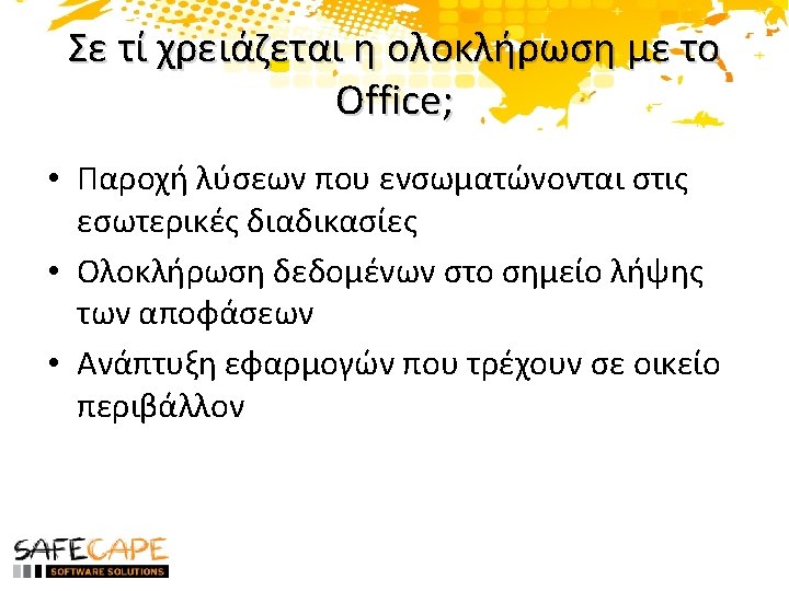 Office Solutions Development • To Office χρησιμοποιεί τις εφαρμογές σας – Document-level customizations – Application-level add-ins • Οι εφαρμογές σας χρησιμοποιούν το Office – Automating Office Applications • Share. Point development