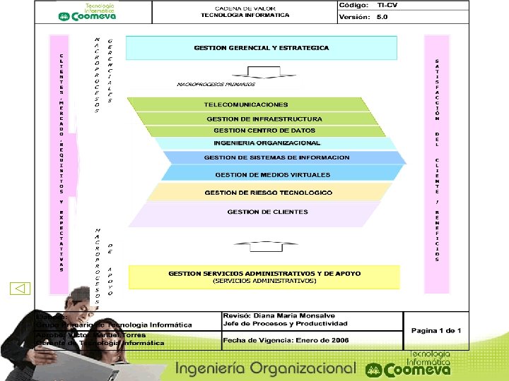 Tecnología Informática COOMEVA Misión: Proveer y administrar productos y servicios de tecnología informática e ingeniería organizacional, para las empresas y unidades de servicio de Coomeva, contribuyendo a la gestión del conocimiento, productividad, competitividad y generando sinergia empresarial. Visión: Ser un referente exitoso Nacional e Internacional, en productos servicios de tecnología informática y de ingeniería organizacional. y